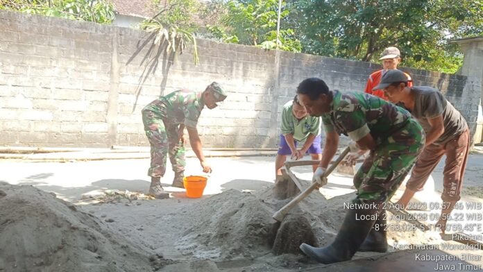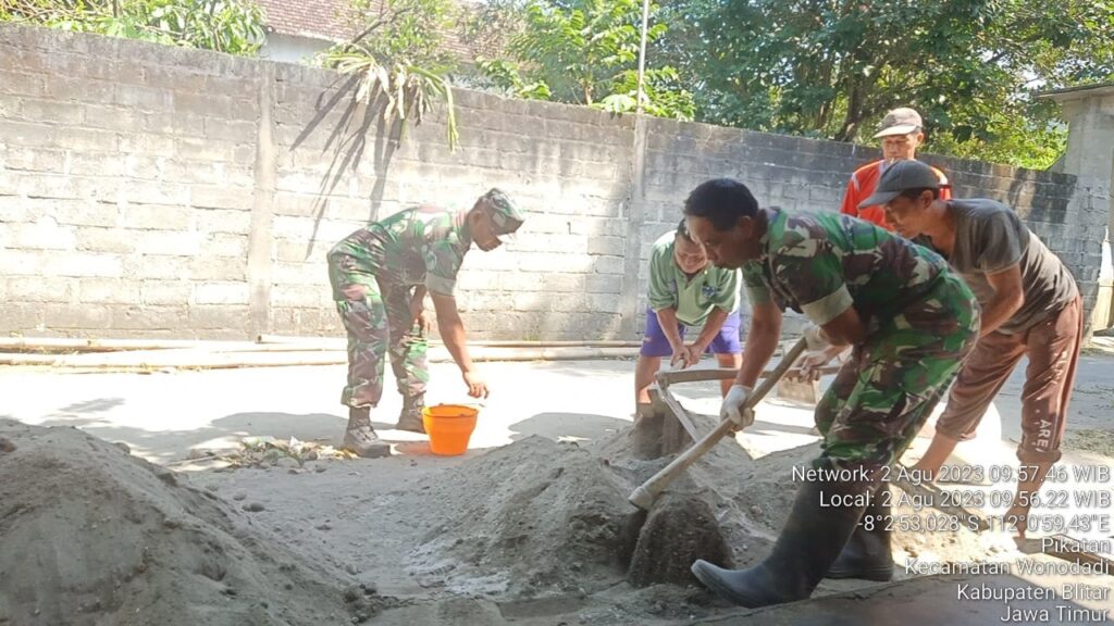 globalcybernews.com-Blitar – Babinsa Koramil 0808/22 Wonodadi Kodim 0808/Blitar Serka Anwari dan warga masyarakat, melaksanakan kegiatan kerja bakti dan gotong royong bersama untuk membantu merehab rumah tidak layak huni milik Bapak Roni, bertempat di Dusun Plosokembang RT. 03 RW. 02 Desa Pikatan Kec. Wonodadi Kab. Blitar, Rabu (2/8/2023).