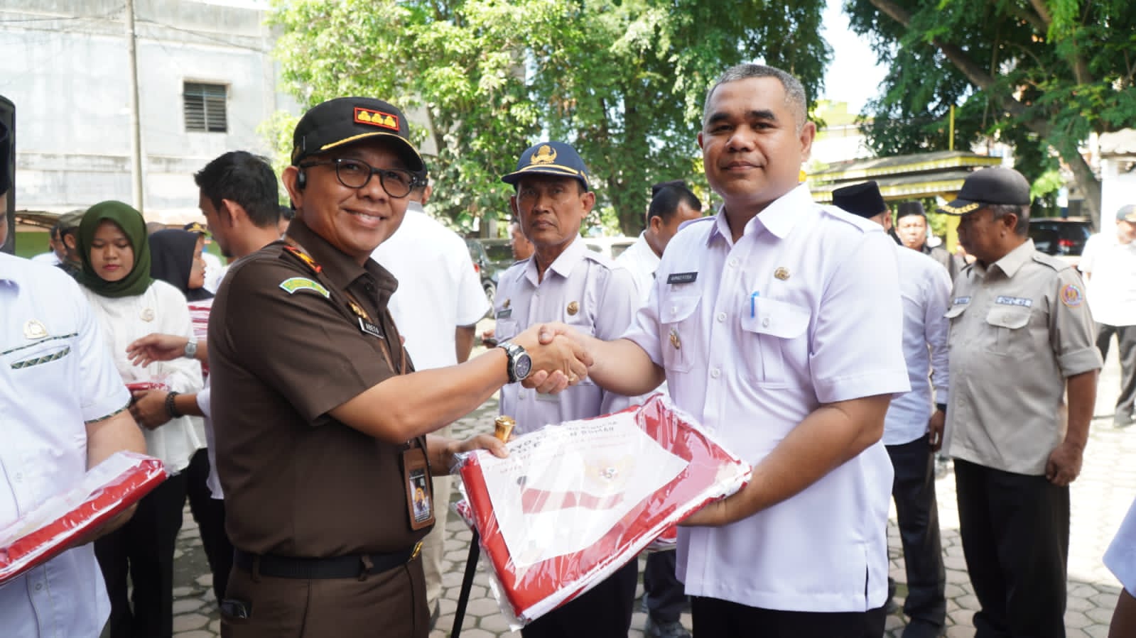 Pembagian Bendera Merah Putih diserahkan secara simbolis oleh Plt Bupati Langkat kepada 5 orang perwakilan Camat di Kabupaten Langkat dan perwakilan Masyarakat Kabupaten Langkat, di Halaman Gedung Juang 45 Kabupaten Langkat, Stabat.