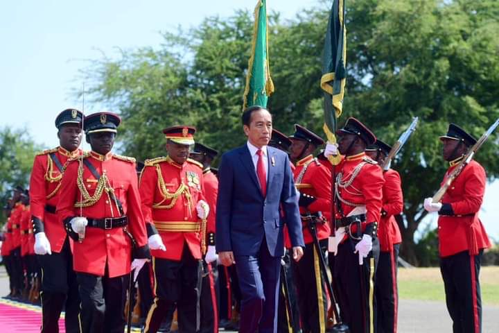 Cuaca cerah tepi pantai mengiringi upacara penyambutan kenegaraan. Tiba sekira pukul 10.00 waktu setempat (WS) atau 14.00 WIB, Presiden Jokowi disambut secara langsung oleh Presiden Samia di halaman depan Dar Es Salaam State House.