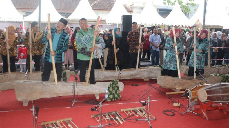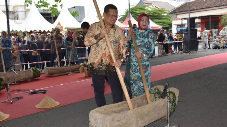 Simbolis pembukaan diawali dengan pemukulan lesung oleh Bupati Maryoto, Ny. Siyuk Rihayati Maryoto Birowo dan jajaran forkopimda.
