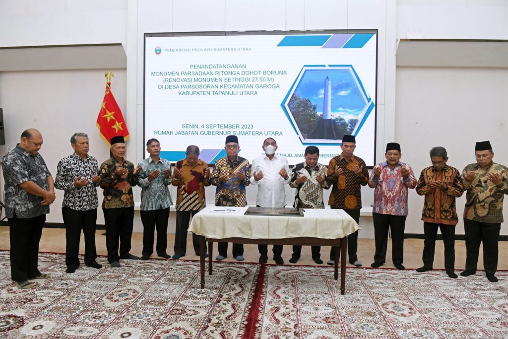 globalcybernews.com-Medan I Gubernur Sumatera Utara (Sumut) Edy Rahmayadi menandatangani Prasasti Renovasi Monumen Parsadaan Ritonga Dohot Boruna, yang berada di Desa Parsorsoran, Garoga, Tapanuli Utara (Taput). Monumen tersebut yang awalnya memiliki tinggi 9 meter, setelah direnovasi menjadi 27,5 meter.