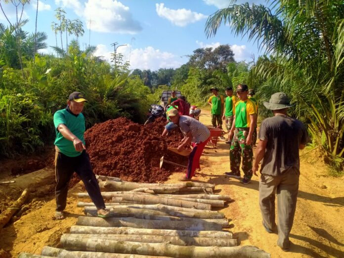 globalcybernews.com-Sintang – Jalin kemanunggalan dengan masyarakat perbatasan, Satgas Pamtas RI – Malaysia Yonarmed 10/ Bradjamusti Pos Kout membantu membangun jalan desa Di Senanning, Kecamatan Ketungau Hulu , Kabupaten Sintang, Kalbar. Senin ( 04/09/2023 )