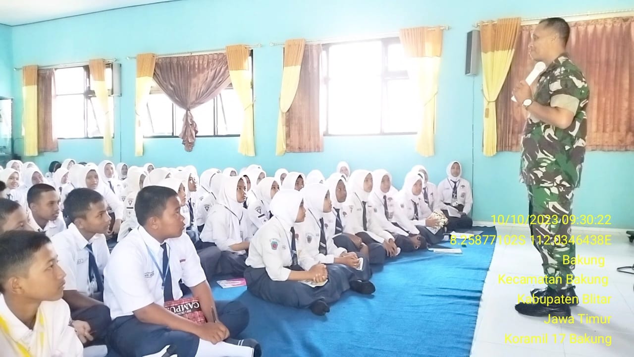 Untuk mewujudkan generasi muda yang berkualitas, anggota Koramil 0808/17 Bakung Kodim 0808/Blitar Pelda Tulus Widodo, melaksanakan kegiatan memberikan wawasan kebangsaan kepada siswa siswi, bertempat di SMKN 01 Bakung Kec. Bakung Kab. Blitar, Selasa (10/10/2023).