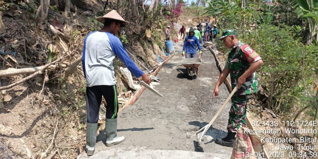 Seperti terlihat saat ini, Serda Edy Siswanto bersama warga masyarakat saling bergotong royong, bekerja sama untuk melaksanakan kegiatan pembangunan jalan, bertempat di Dusun Sweden Desa Kaligrenjeng Kec. Wonotirto Kab. Blitar, Jumat (13/10/2023).