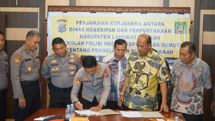 Selanjutnya Plt Bupati Langkat H.Syah Afandin SH melakukan penandatanganan MoU Tentang Perpustakaan antara Pemerintah Kabupaten Langkat dengan  SPN Hinai Polda Sumut  bertempat di Kantor Bupati Langkat, Jumat (20/10/2023).