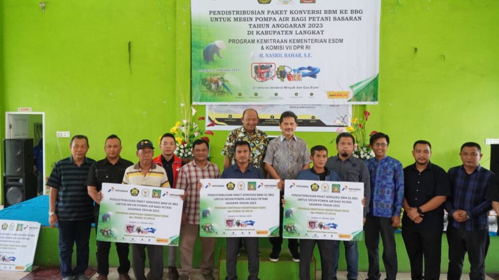 Plt Bupati Langkat H.Syah Afandin SH mendistribusikan paket konversi BBM ke BBG untuk mesin pompa air bagi petani sasaran tahun anggaran 2023 di Kabupaten Langkat, bertempat di Jambur Kecamatan Selesai, Sabtu 21 Oktober 2023.