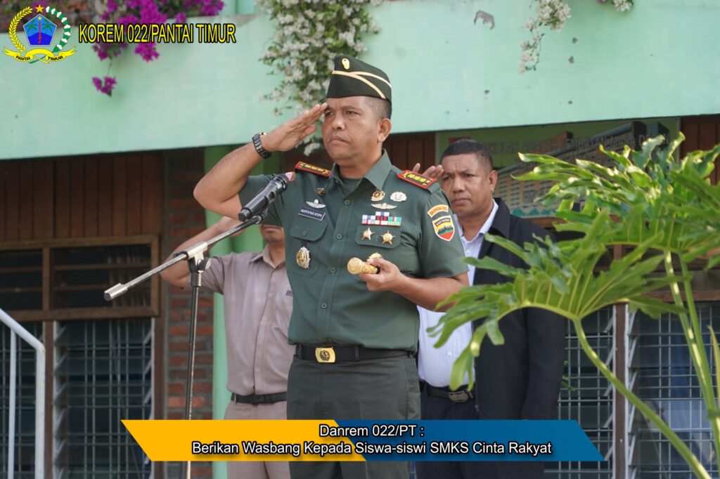 Dalam kesempatan ini Danrem 022/PT menyampaikan pentingnya menanamkan disiplin sejak dini, karena untuk meraih suatu kesuksesan harus dimulai dari disiplin pribadi , serta pentingnya kegiatan belajar sebagai bekal ilmu pengetahuan dan modal dasar membentuk generasi muda yang berkarakter dan mampu melanjutkan pembangunan Bangsa di segala bidang, serta pentingnya menanamkan Nilai Nilai Wawasan Kebangsaan dan rasa Nasionalisme sebagai Generasi Muda,” ucap Danrem.