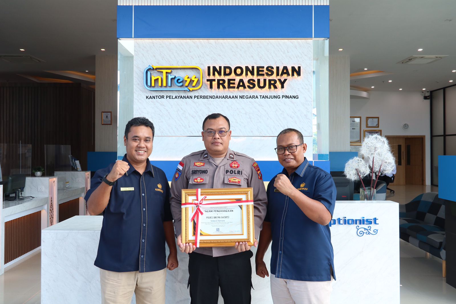 Apresiasi dan penghargaan yang diberikan oleh Ketua KPPN Tanjungpinang kepada Polres Bintan yang diserahkan oleh Kasi MSQI KPPN Tipe A1 Tanjungpinang Royhul Akbar didampingi Kabag Umum Kanwil DJPB Provinsi Kepri Haris Budi Susilo yang diterima oleh Kasikeu Polres Bintan AIPDA Sriyono mewakili Kapolres Bintan AKBP Riky Iswoyo, S.I.K., M.M..