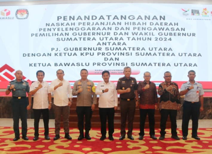 globalcybernews.com -Medan – Pj Gubernur Sumut Dr Hassanudin memperkuat pernyataan Kepala Badan Kesbangpol Sumut Ardan Noor, penandatanganan hibah kepada KPU dan Bawaslu Sumut bukti komitmen Pemprovsu mendukung sukses Pilgubsu 2024.“Sebagaimana disampaikan Kepala Badan Kesbangpol Sumut, penandatanganan hibah merupakan amanah undang-undang dan komitmen Pemprovsu demi suksesnya tahapan-tahapan Pilgubsu 2024,” ujarnya, Rabu (15/6). Berbicara pada penandatanganan Naskah Perjanjian Hibah Daerah antara Pj Gubsu dengan Ketua KPU Sumut Agus Arifin dan Ketua Bawaslu Sumut Aswin Diapari Lubis di Kantor Gubsu di Medan, Pj Gubsu mengakui sukses Pilgubsu bukan hanya dari hibah, melainkan peran semua pihak. “Mari kita bergandengtangan untuk suksesnya Pilgubsu (Pemilihan Gubsu dan Wakil Gubsu - red) 2024,” ujar Pj Gubsu setelah menyerahkan hibah berupa alokasi anggaran untuk pengawasan dan penyelenggaraan Pilgubsu 2024.