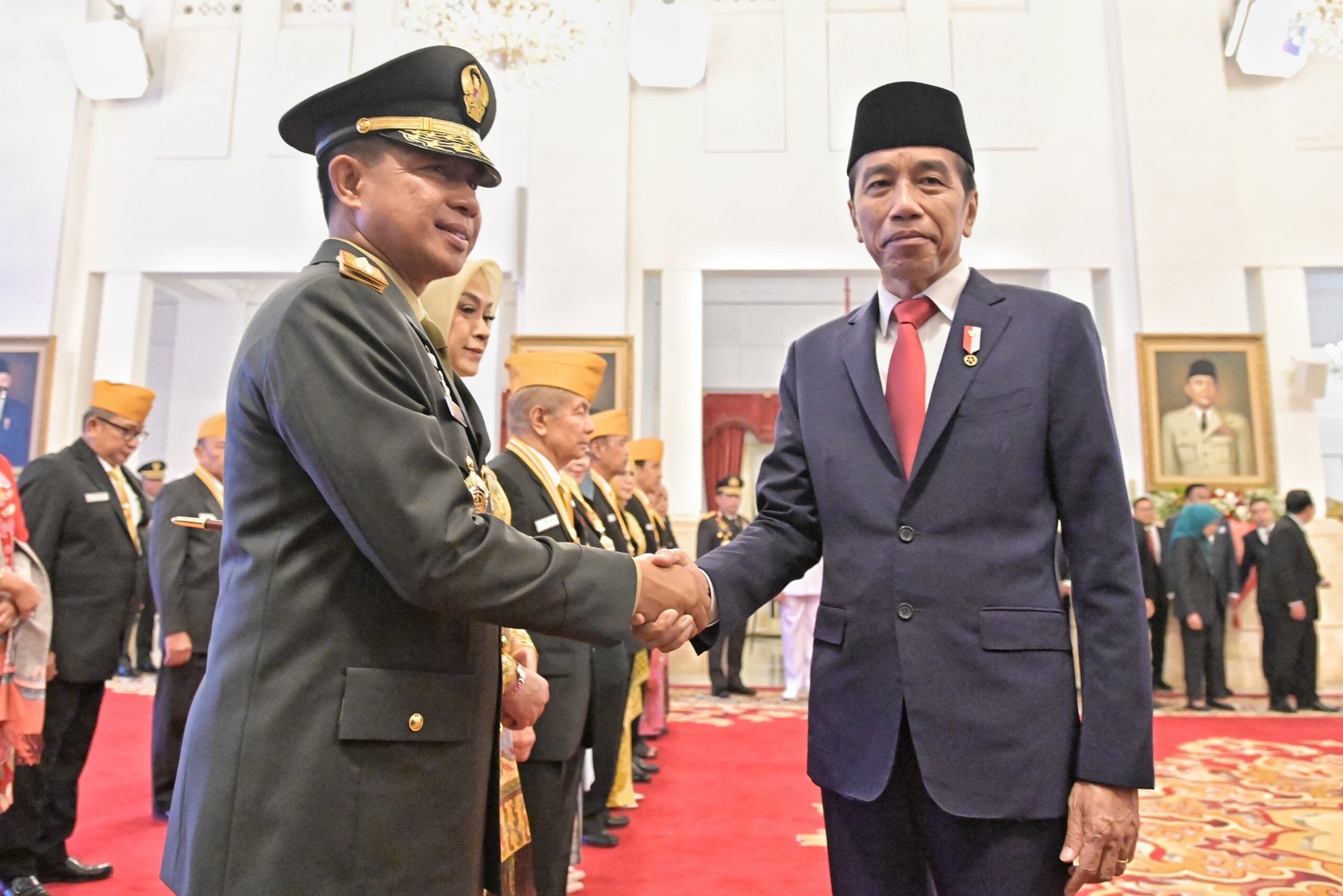 Dalam kesempatan tersebut Presiden Joko Widodo menyematkan tanda pangkat dan menyerahkan tongkat komando kepada Jenderal TNI Agus Subiyanto.