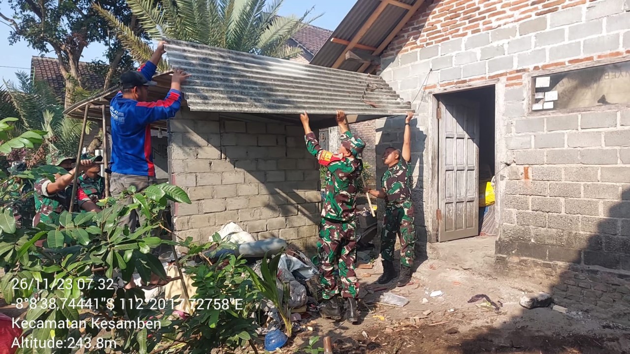 Anggota Koramil Kesamben menunjukkan komitmennya dalam membantu warga masyarakat, dengan turut serta dalam kegiatan memperbaiki rumah warga yang membutuhkan bantuan.
