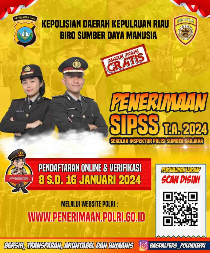 Kapolres Bintan AKBP Riky Iswoyo, S.I.K., M.M melalui Kasi Humas Iptu Missyamsu Alson membenarkan bahwa Polri telah membuka pendaftaran penerimaan Sekolah Inspektur Polisi Sumber Sarjana (SIPSS) Polri tahun anggaran 2024.