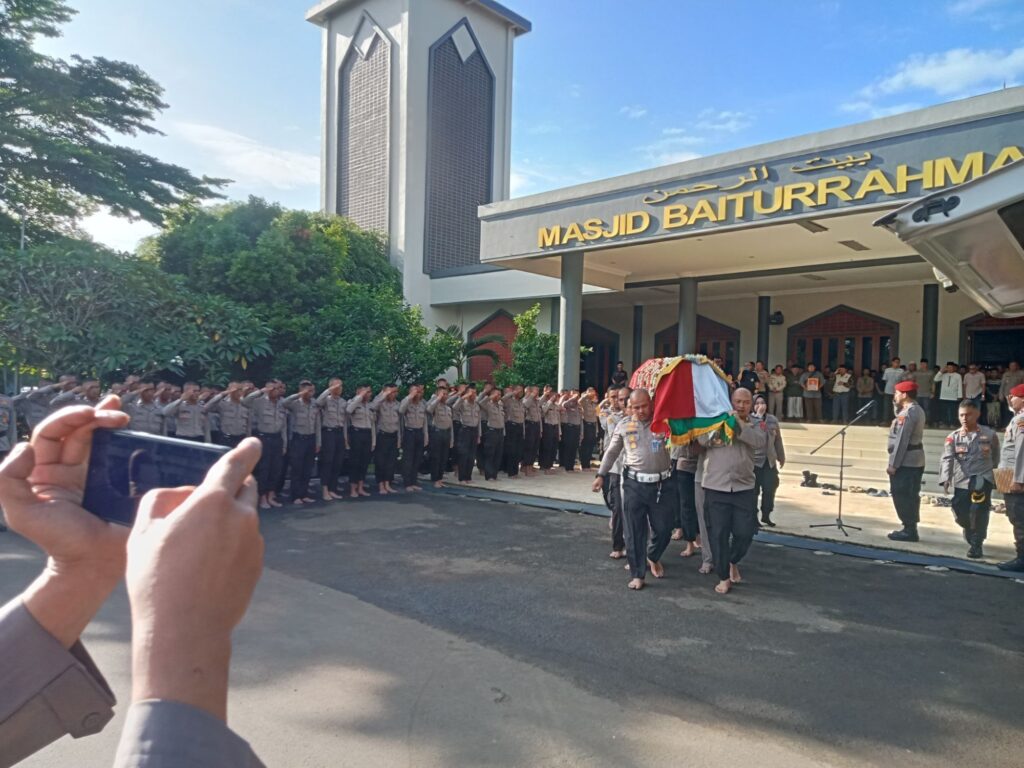 globalcybernews.com  -Serang – Upacara pemberangkatan jenazah Almarhum Kabagdalopsnal Ditreskrimsus Polda Banten AKBP Edi Mulyono dipimpin oleh PS Kasubdit 5 Ditreskrimsus Polda Banten Kompol Rafles bertempat di masjid Baiturrahman Polda Banten pada Selasa (13/02).