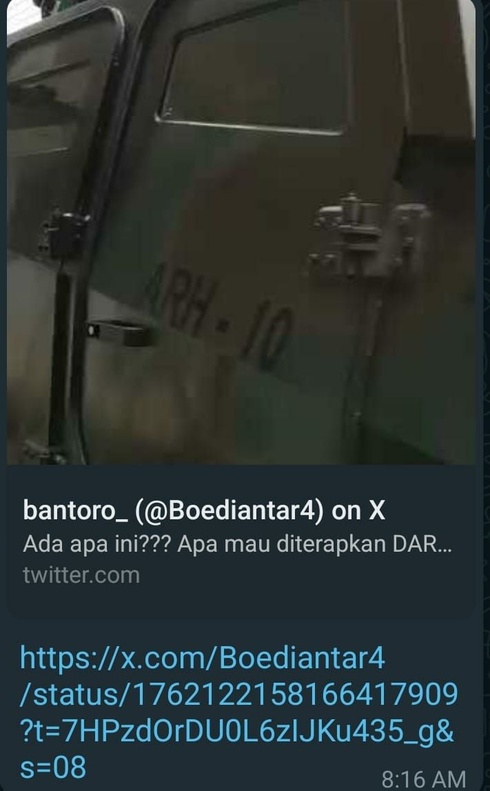 Pada kesempatan yang sama, Kadispenad menyayangkan informasi Hoax yang dicuitkan oleh akun X Bantoro_Boediantar4, dan selanjutnya akan berkoordinasi dengan pihak yang bertanggung jawab dalam penanganan informasi Hoax. Sebab, postingan tersebut telah menimbulkan ketidaknyamanan dan berpotensi mengganggu kondusifitas keamanan masyarakat. (Dispenad)