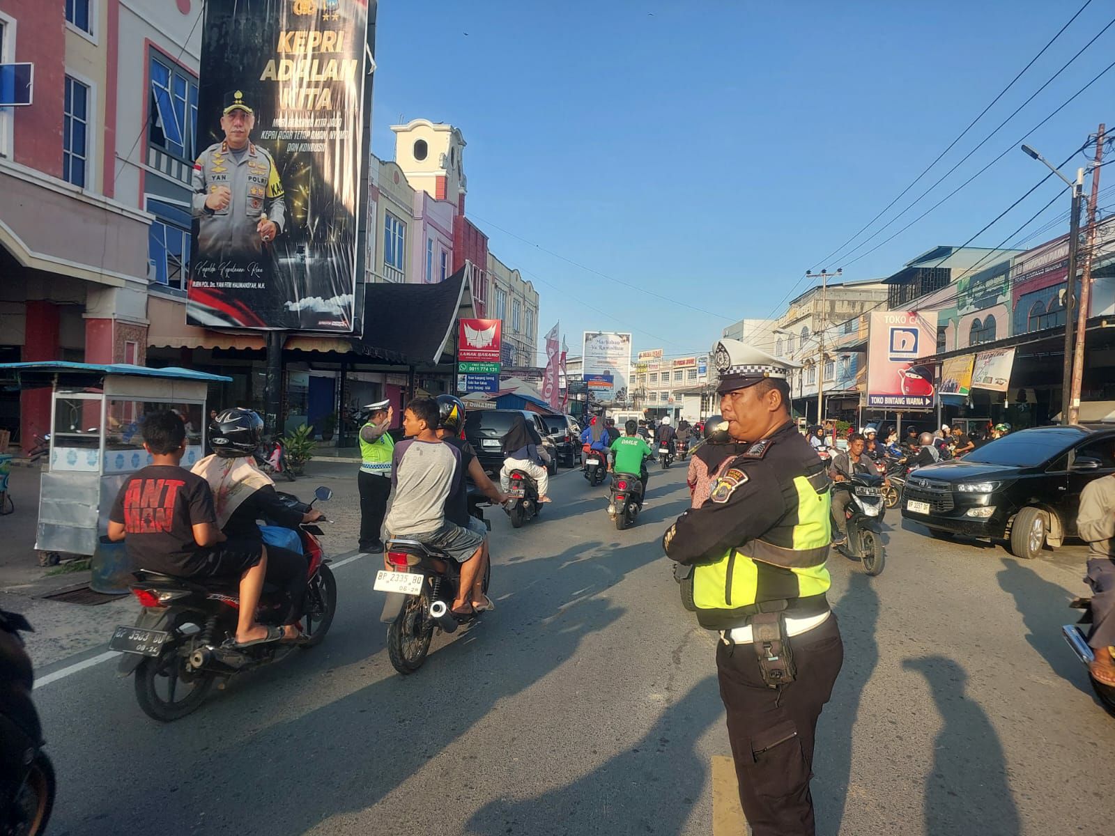 Personil Sat lantas Polres Bintan dan personel Polsek melaksanakan pengamanan untuk memberikan rasa aman kepada pengguna jalan dan para pembeli yang ingin berbelanja di pasar tumpah di yang ada di kabupaten Bintan, yang tepatnya di kelurahan Kijang Kota Kecamatan Bintan Timur dan wilayah Bintan Utara.