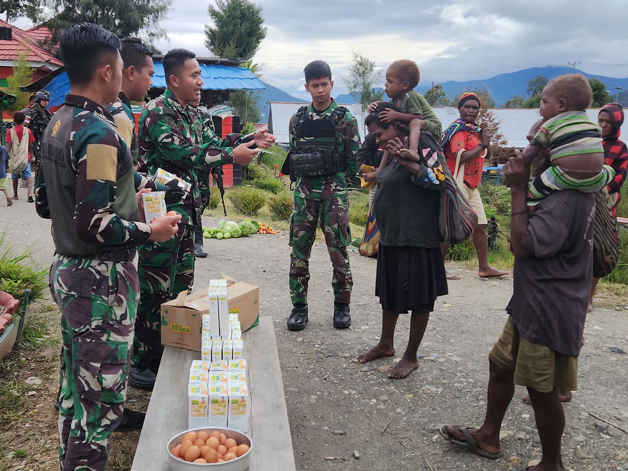 Dansatgas Yonif 330/Tri Dharma, Mayor Inf Dedy Pungky Irawanto, S.I.P., M.I.Pol. menjelaskan bahwa Satgas 330 membagikan paket nutrisi dalam bentuk telur rebus, biskuit dan bubur Milna untuk masyarakat di Kabupaten Intan Jaya.