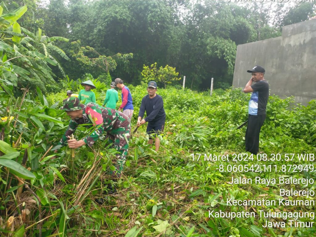 globalcybernews..com  -Tulungagung – Babinsa Desa Balerejo Serda Parji dan Bhabinkamtibmas Bripka Pratama bersama warga masyarakat melaksanakan kegiatan kerja bakti membersihkan lingkungan sekitar sungai di Desa Balerejo Kecamatan Kauman Kabupaten Tulungagung Jawa Timur, Minggu (17/03/2024).