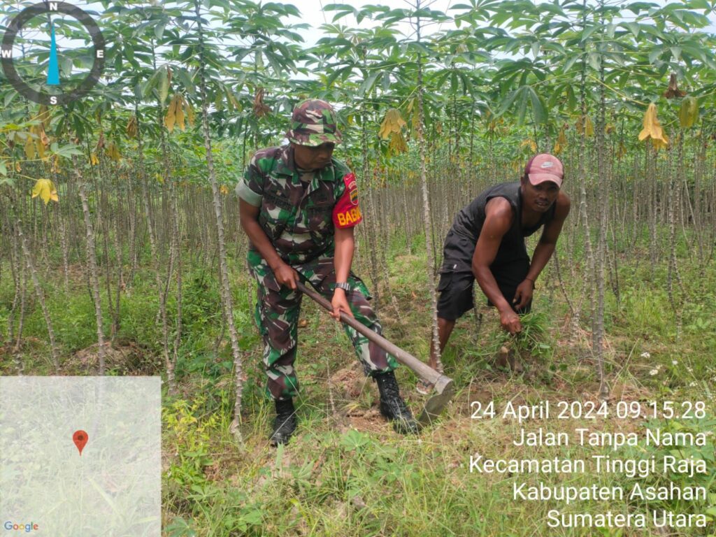 globalcybernews.com -Asahan | Melaksanakan yang dikatakan Bapak Kepala Staf Angkatan Darat Jenderal TNI Maruli Simanjuntak “Point Utama Gerilya Adalah Memenangkan Hati Rakyat, Minimal Kamu Tidak Menyakiti Hati Rakyat, Kalau Bisa Tingkatkan Kesejahteraannya”, Serda Hendro Sucipto Babinsa Koramil 13/BP dibawah Pimpinan Kapten Kav Basri Lubis, melakukan pendampingan dan membantu perawatan ketahanan pangan (Hanpang) di lahan Singkong milik Bapak Sarman bertempat di Dusun I Pekan, Desa Tinggi Raja, Kecamatan Tinggi Raja, Kabupaten Asahan, Rabu (24/04/2024).