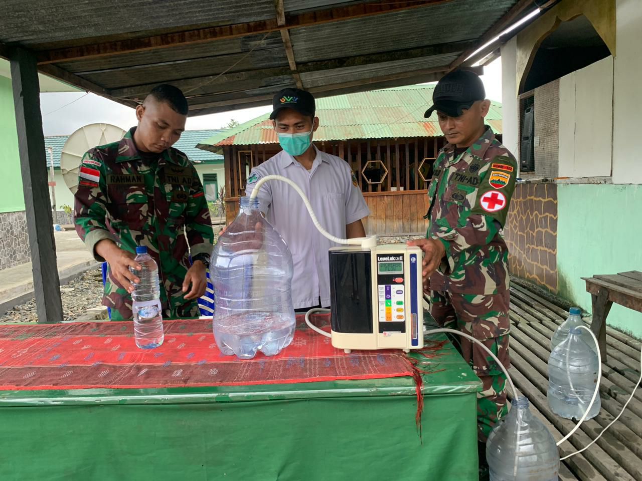 Satgas Pamtas Yonif122/TS menunjukkan kemanunggalan TNI dengan Rakyat melalui membantu pembuatan penyaringan air bersih dilanjutkan menaikan PH air menggunakan mesin kangen water yang berguna bagi masyarakat perbatasan.