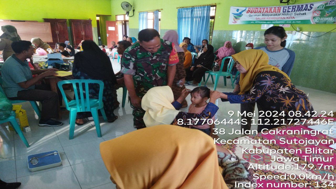 globalcybernews.com -Blitar – Sebagai wujud kepedulian terhadap kesehatan anak dan pencegahan stunting di wilayah binaannya, Serka Dwijo Babinsa Koramil 0808/09 Sutojayan, melaksanakan pendampingan bersama Bidan Desa dalam kegiatan Posyandu anak dan program pencegahan stunting, bertempat di Balai Kelurahan Jegu Kecamatan Sutojayan Kabupaten Blitar, Kamis (9/5/2024).