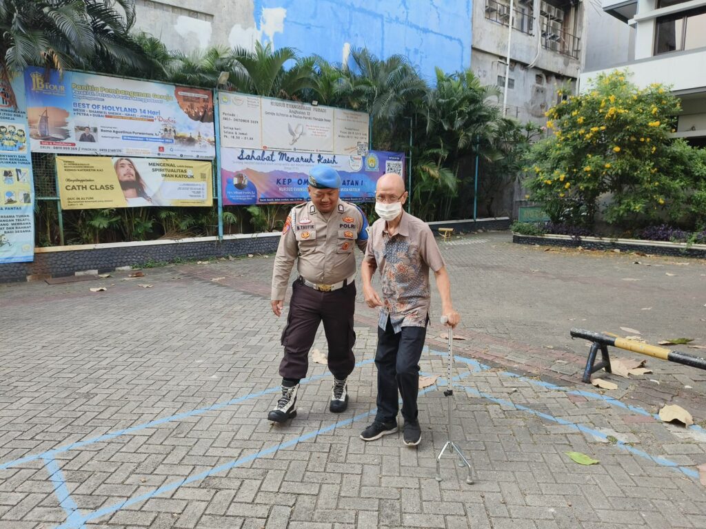 Salah satunya adalah Bripka M. Taufik, yang terlihat dengan penuh perhatian dan kelembutan menggandeng seorang umat yang berusia lanjut untuk memasuki gereja.