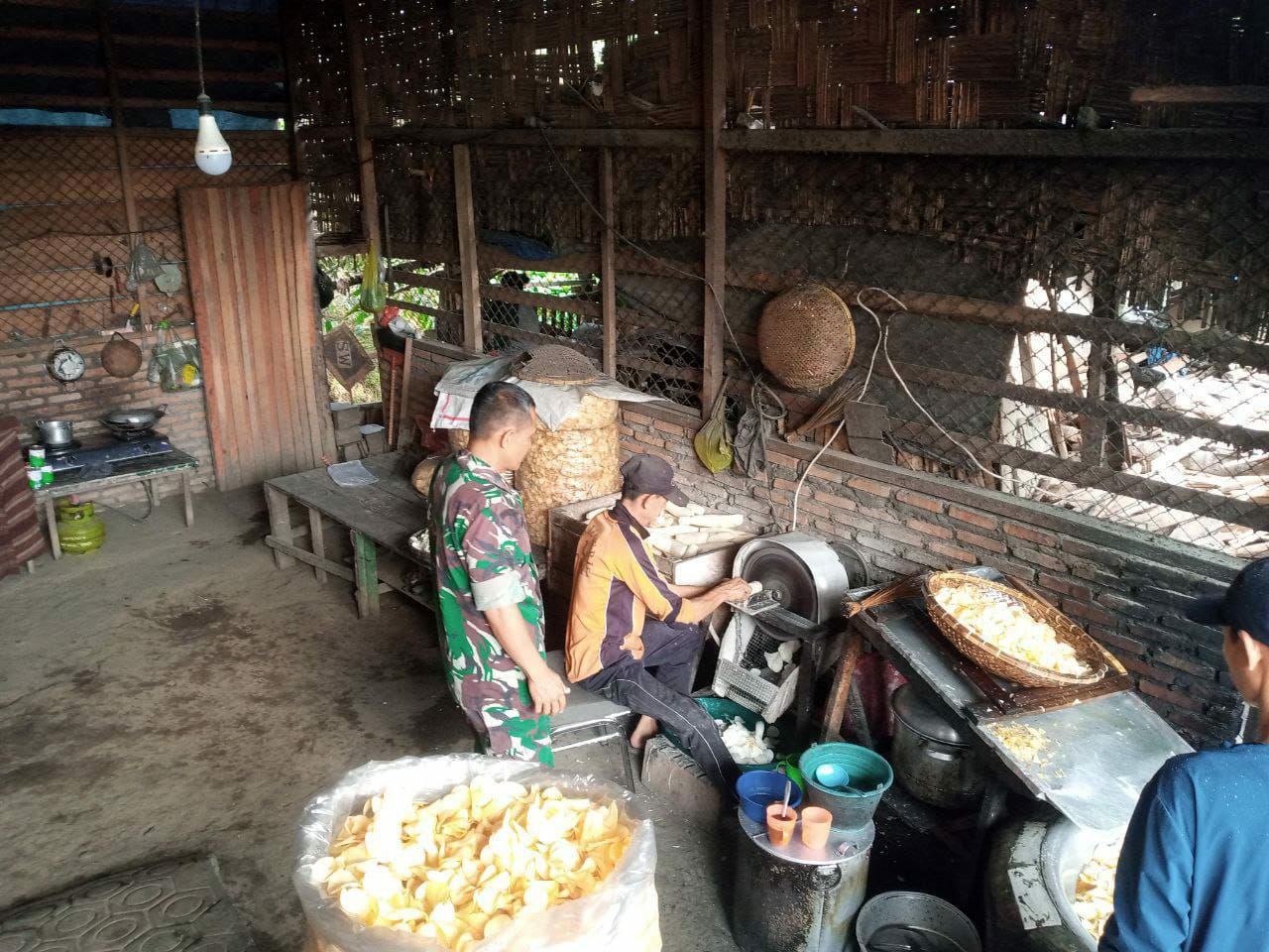 Kegiatan Anjang sana Babinsa bersama Bapak Sukardi pemilik UMKM Kerupuk ubi dan pisang untuk membantu ekonomi pak Sukardi untuk di jual di Warung pinggir jalan usaha milik keluarganya dan itu cukup menambah Ekonomi Keluarga dan kebutuhan sehari-hari.