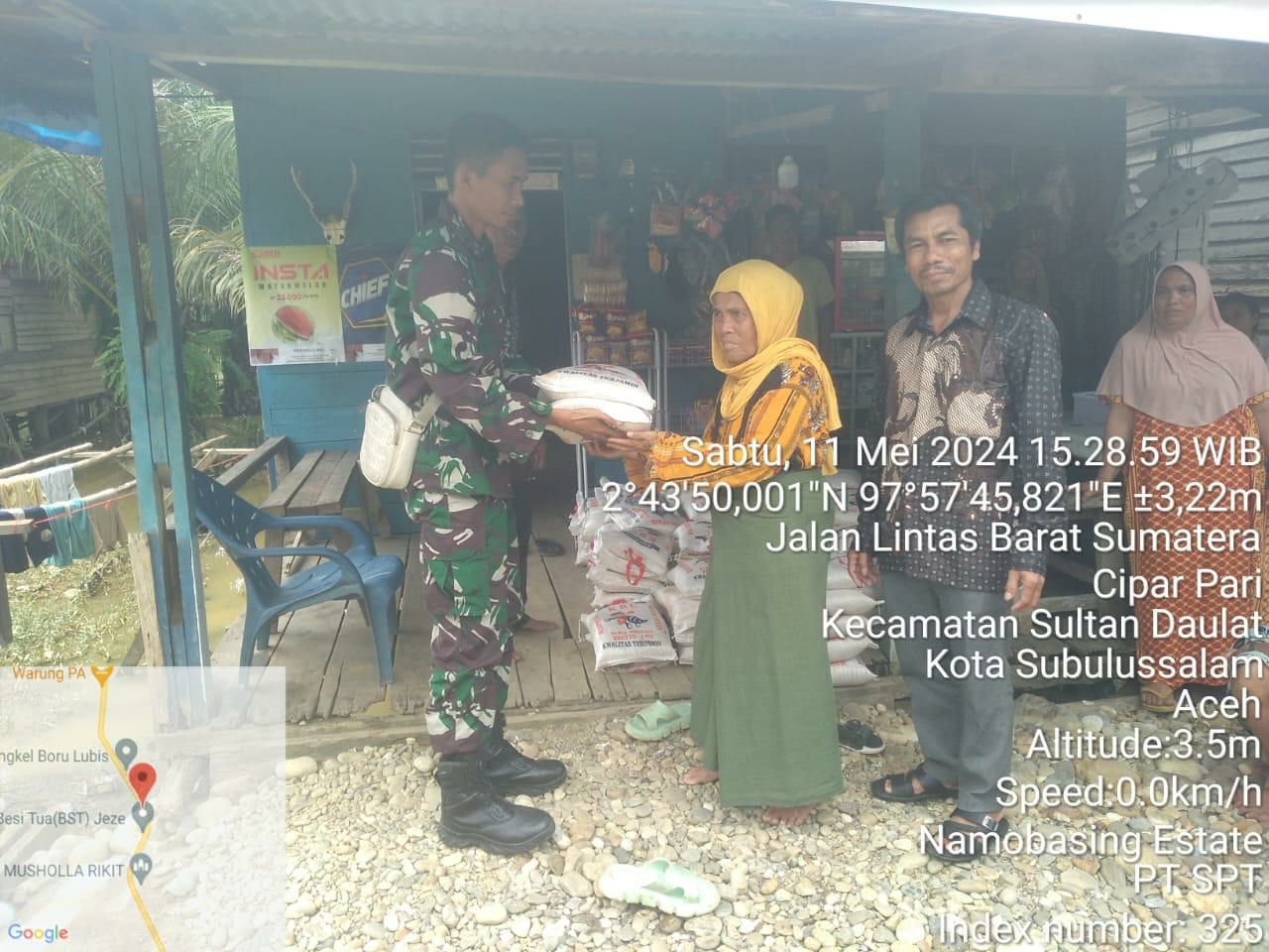 bantuan beras kepada warga terdampak banjir yang diserahkan langsung secara simbolis oleh Manajer PT SPT didampingi Babinsa