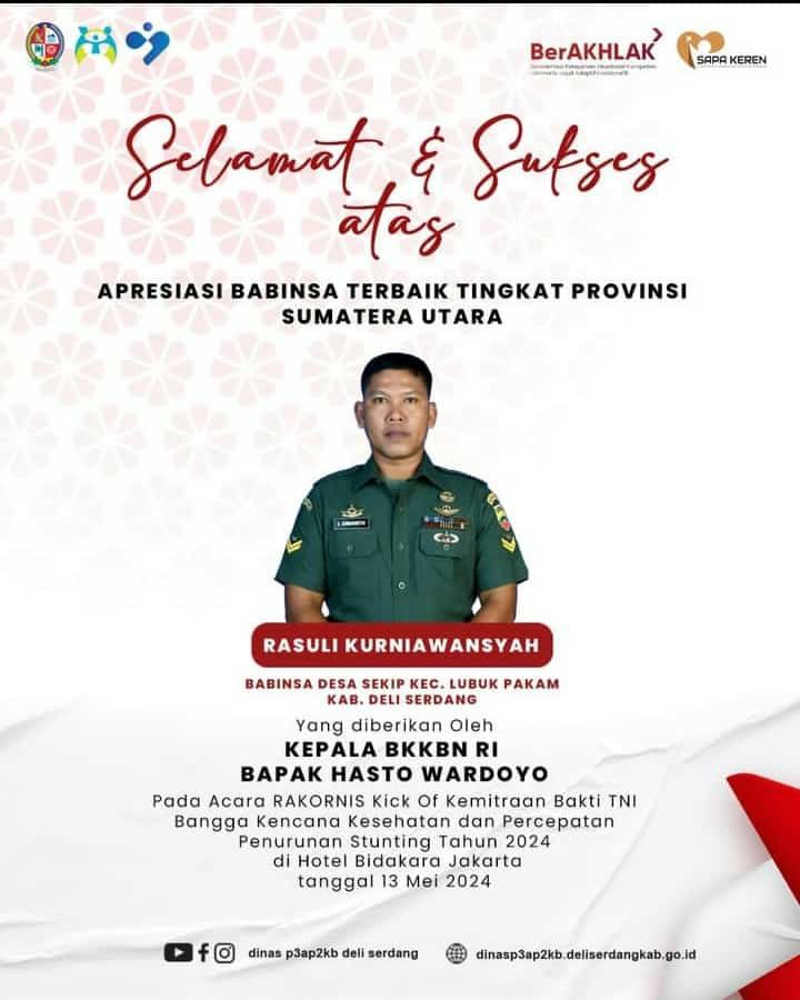 Sertu Rasuli Kurniawansyah mendapat penghargaan sebagai Babinsa terbaik atas dedikasi, dan kegigihannya dalam melayani masyarakat, serta dukungannya terhadap pelaksanaan program pencegahan stunting di desa binaannya.