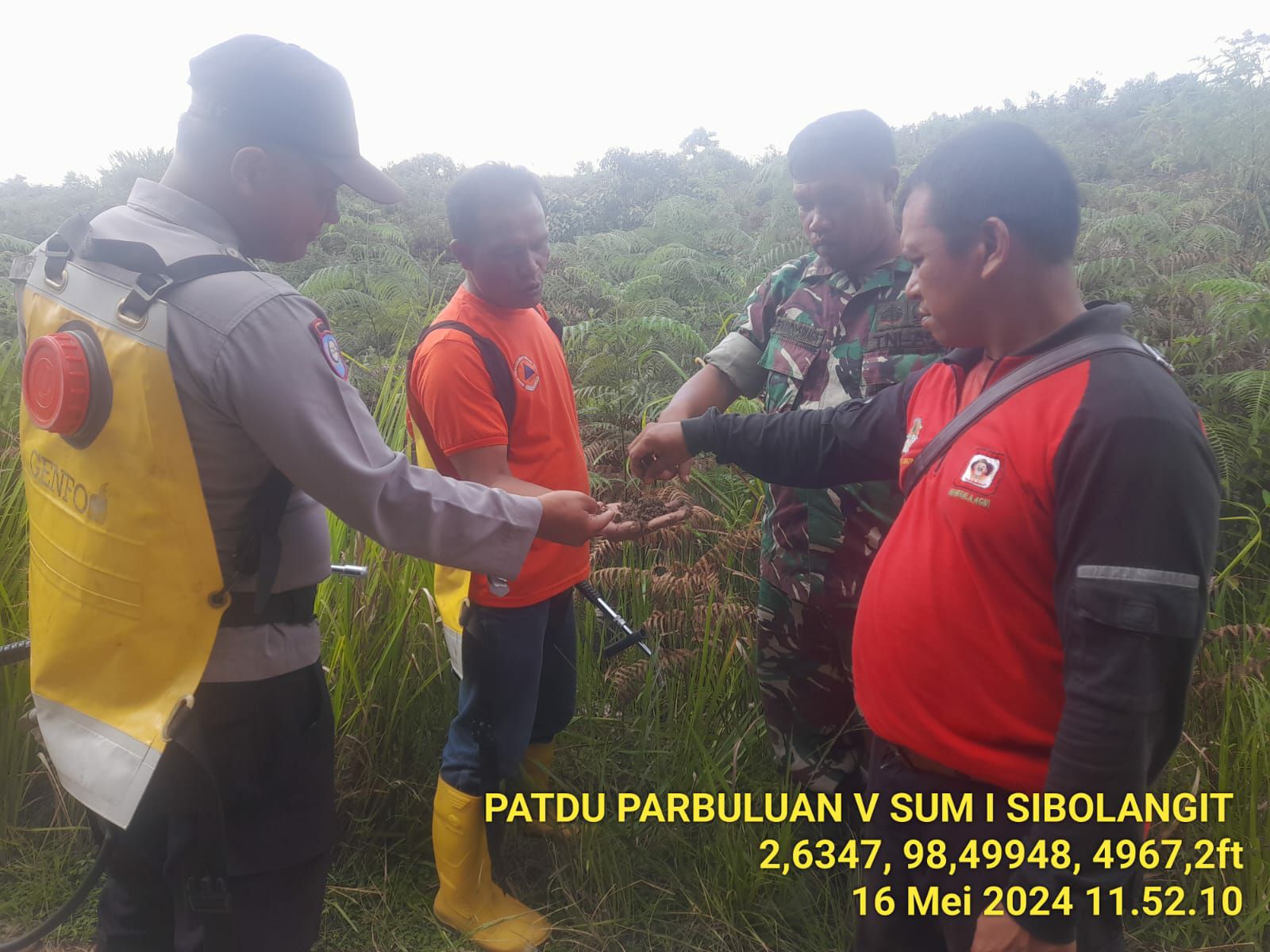 Kegiatan patroli terpadu ini melibatkan A. Sialoho dan E. Suranta dari Manggala Agni, Briptu D. Damanik dari Bhabinkamtibmas, dan N. Sagala selaku Kepala Dusun 2.