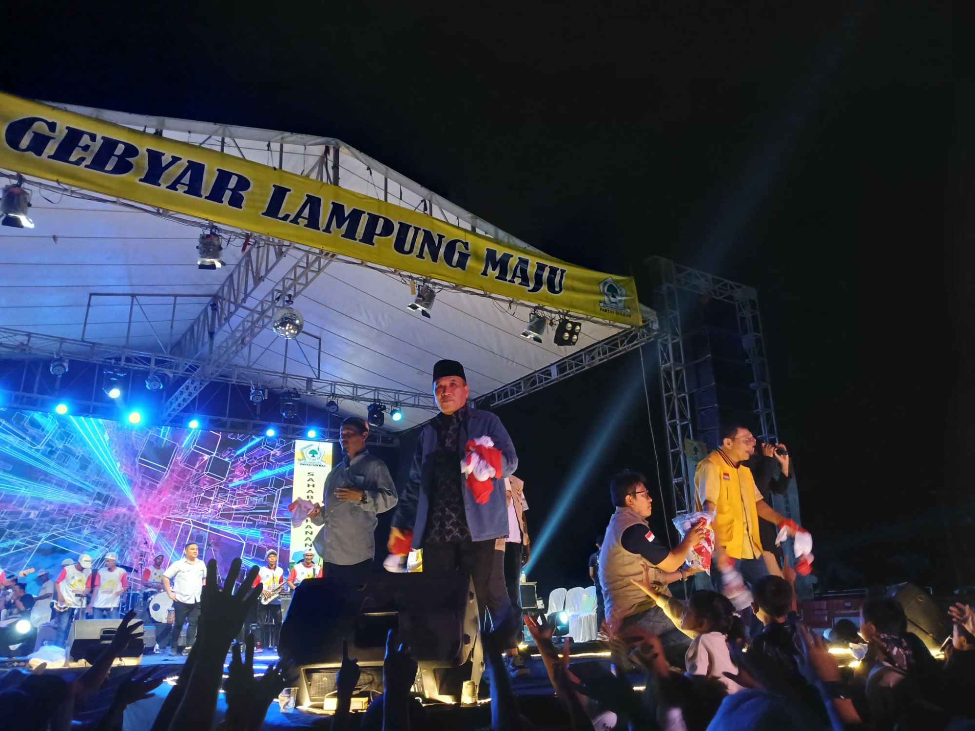 gloalcybernews.com  -Lampung Tengah | Bertempat di Lapangan Desa Dono Arum, Kecamatan Seputih Agung, Kabupaten Lampung Tengah gelaran konser musik gratis bertajuk gebyar Lampung Maju dilaksanakan oleh tim kerja pemenangan Bakal Calon Gubernur (Bacagub) Lampung, Ir. H. Hanan A Rozak, MS, pada Sabtu (25/5/2024) malam.