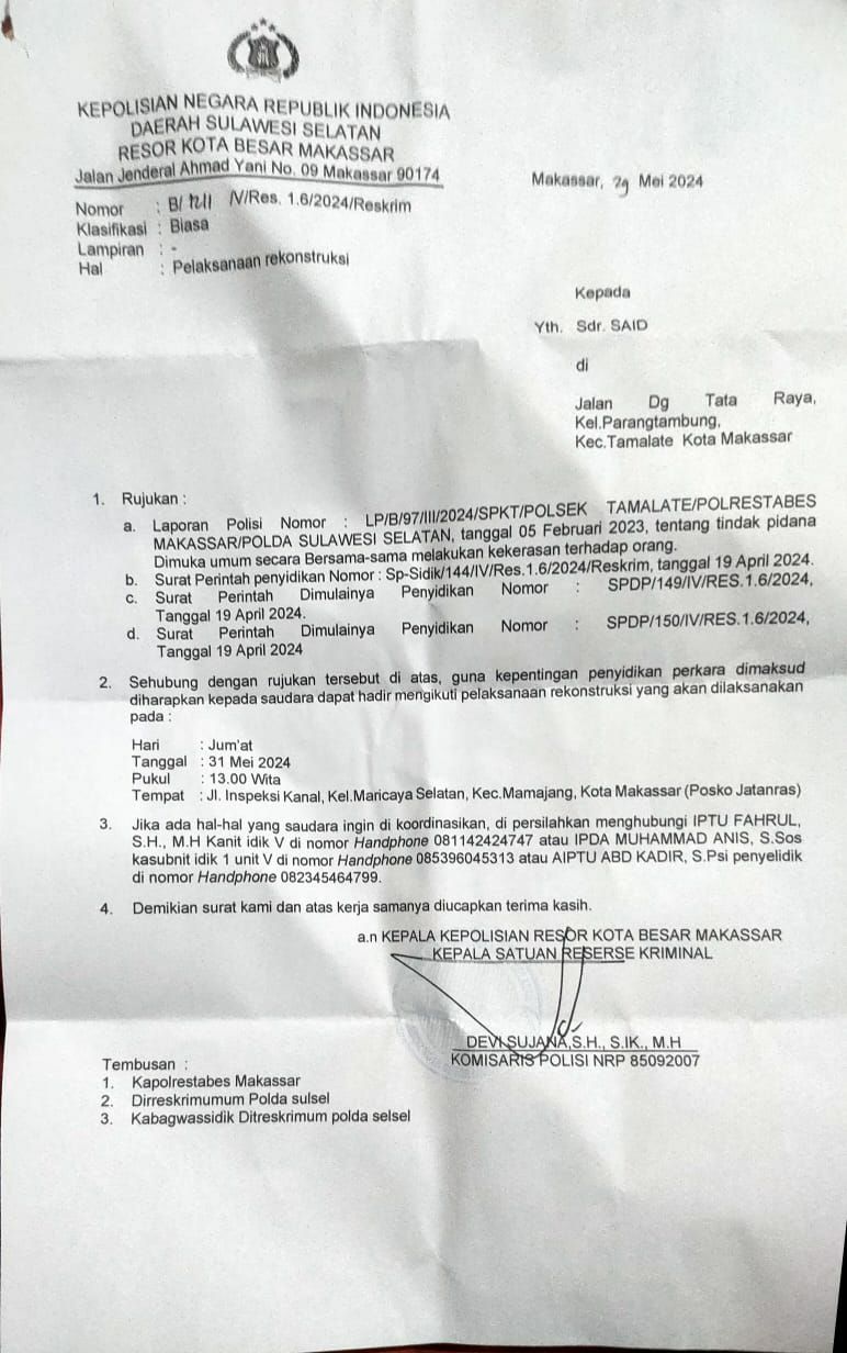 Berdasarkan undangan dari Polrestabes Makassar dengan Nomor: B/1211/V/Res.1.6/2024/Reskrim, perihal Pelaksanaan Rekonstruksi tertanggal 29 Mei 2024, rekonstruksi dijadwalkan pada hari Jumat, 31 Mei 2024, bertempat di Posko Jatanras Rappocini pukul 13.00 WITA.
