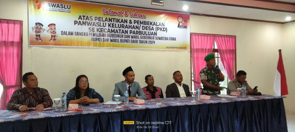globalcybernews.com -Sidikalang, – Babinsa Koramil 02/Sidikalang, Kodim 0206/Dari Sertu G. Sinulingga, mewakili Danramil Kapten Inf T Aritonang, menghadiri kegiatan pelantikan dan pembekalan Panwaslu Kelurahan/Desa (PKD) Se Kecamatan Parbuluan dalam rangka Pemilihan Gubernur dan Wakil Gubernur Sumatera Utara, Bupati dan Wakil Bupati Dairi Tahun 2024.