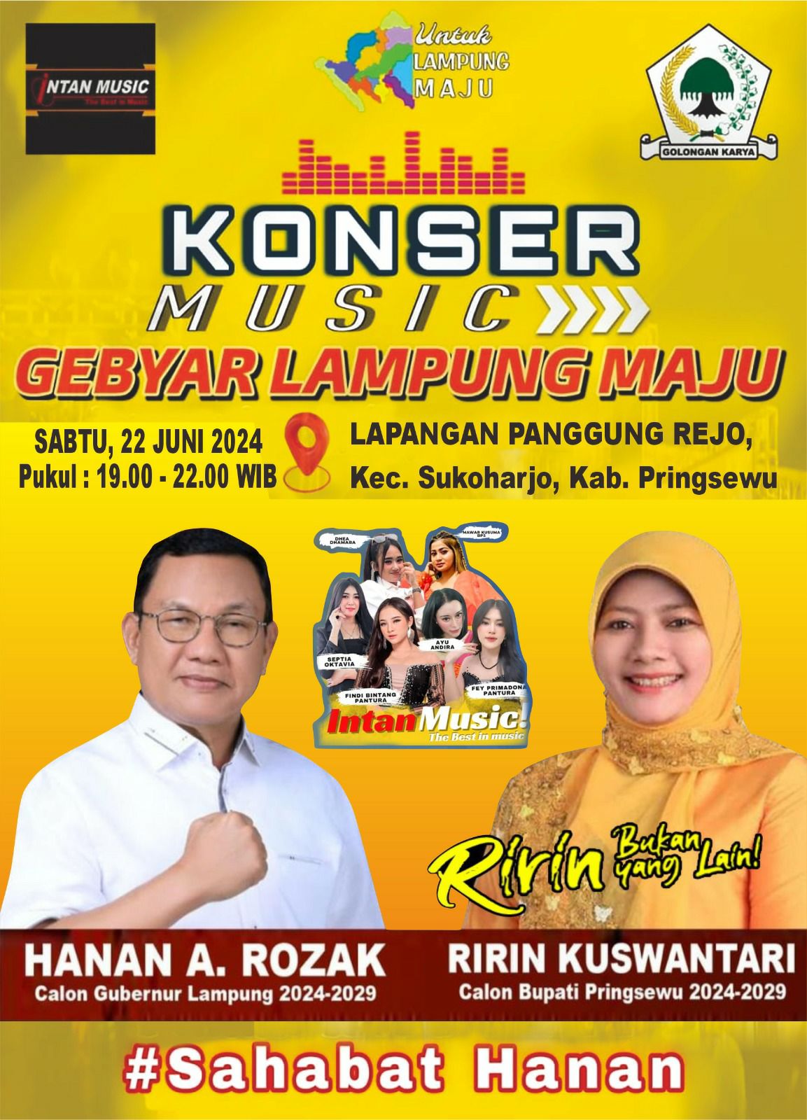 “Assalammualaikum, pripun kabare, Kami ingin mengajak seluruh Masyarakat di Kabupaten Pringsewu, khususnya diseputaran Kecamatan Sukoharjo, Adiluwih dan Gading Rejo untuk sama-sama kita bergembira menikmati hiburan gratis, konser musik Gebyar Lampung Maju yang diselenggarakan oleh Pak Hanan sebagai calon Gubernur Lampung dan Mbak Ririn sebagai Calon Bupati Kabupaten Pringsewu”, kata Ririn yang merupakan anggota DPRD Provinsi Lampung dari daerah pemilihan Pringsewu, Pesawaran, dan Metro pada Jumat (21/6/2024)