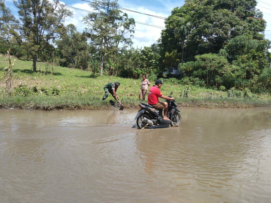 Selanjutnya, Babinsa dan warga bersama-sama membuat parit saluran pembuangan air hujan agar air cepat kering. Tak lupa, imbauan kepada pengguna jalan agar berhati-hati karena jalan masih basah dan berlumpur juga disampaikan.