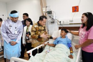 Rasa syukur dan bahagia terpancar dari wajah Wali Kota Medan Bobby Nasution saat menemani Duta Besar Arab Saudi untuk Indonesia Faisal Abdullah H Amodi dan Menteri Kesehatan (Menkes) RI Budi Gunadi Sadikin mengunjungi pasien anak pasca operasi jantung di RSUP H Adam Malik, Jalan Bunga Lau, Kemenangan Tani, Kecamatan Medan Tuntungan, Jum’at (28/6).