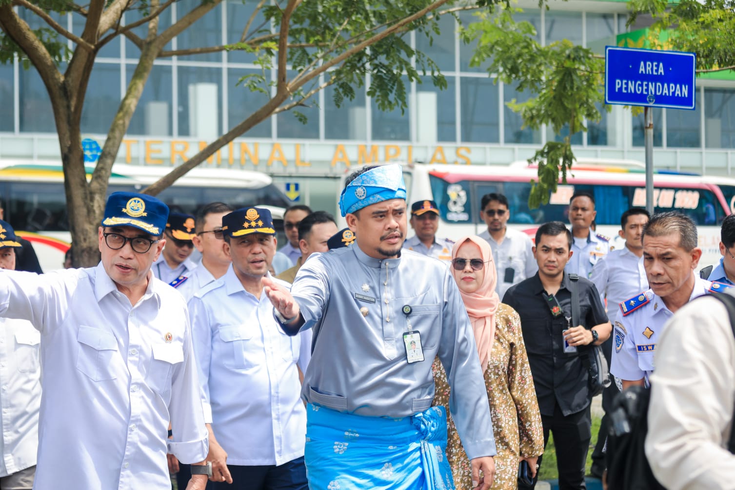 Wali Kota Medan Bobby Nasution mendampingi Menteri Perhubungan Budi Karya Sumadi meninjau Terminal Tipe A Amplas di Jalan Panglima Denai, Kecamatan Medan Amplas, Kota Medan, Jumat (28/6/2024). Selain melihat perkembangan terminal Amplas dan mengevaluasi pinjaman dari World Bank, kehadiran Menhub juga untuk melihat Mastran Bus Rapid Transit (BRT) Mebidang.