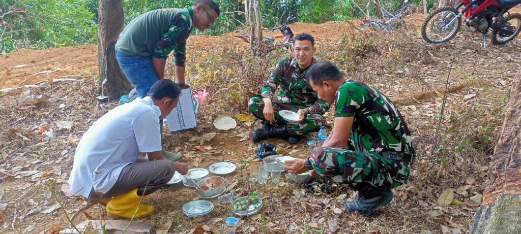 Anggota Satgas TMMD bersama masyarakat setempat, mereka berkumpul dalam suasana akrab dalam makan siang bersama di salah satu lokasi sasaran fisik program TMMD bertempat di Lagan Kaciak Nagari Lagan Mudiak Punggasan Kecamatan Linggo Sari Baganti.