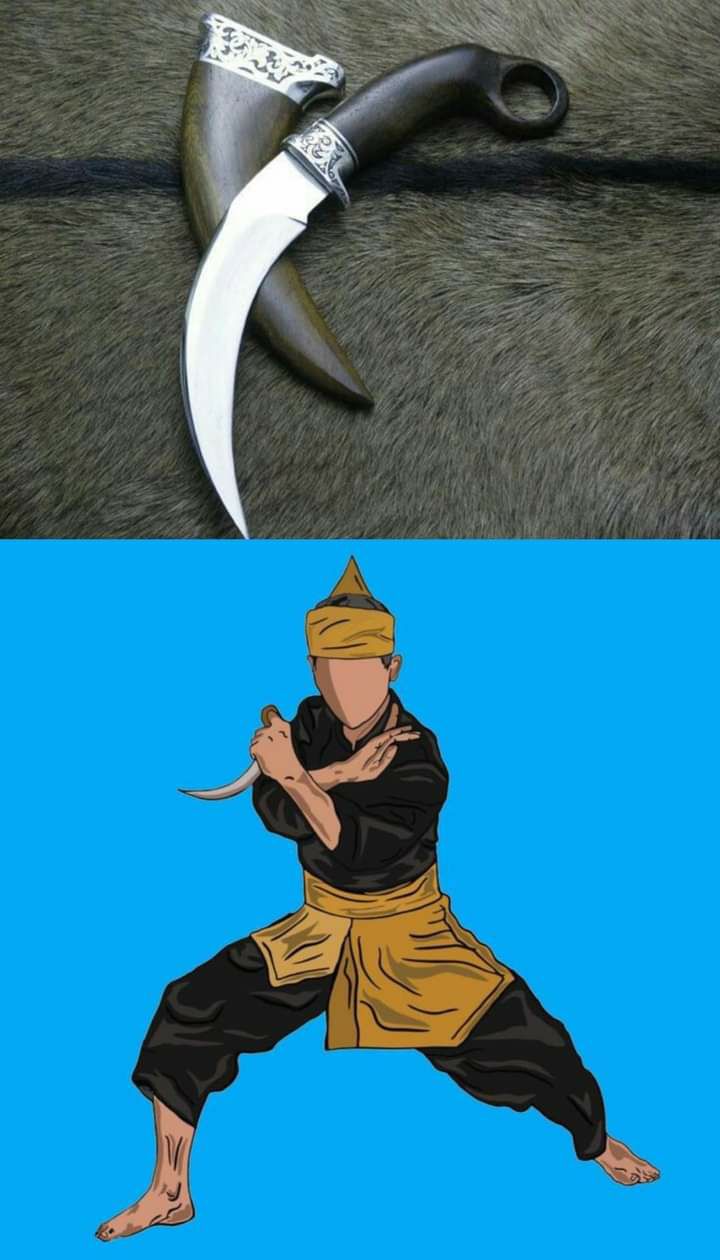 4.karambit kurambik karambiak[kerambit] adalah senjata tradisional Minangkabau yang terkenal [di dunia militer] sebagai senjata bertarung jarak dekat senjata ini dibuat tahun 1827 yang terinspirasi dari cakar harimau yang melengkung karambiak terbuat dari bahan logam besi kayu tanduk dengan panjang 19cm:kerambit biasanya digunakan oleh perguruan pencak silat & militer
