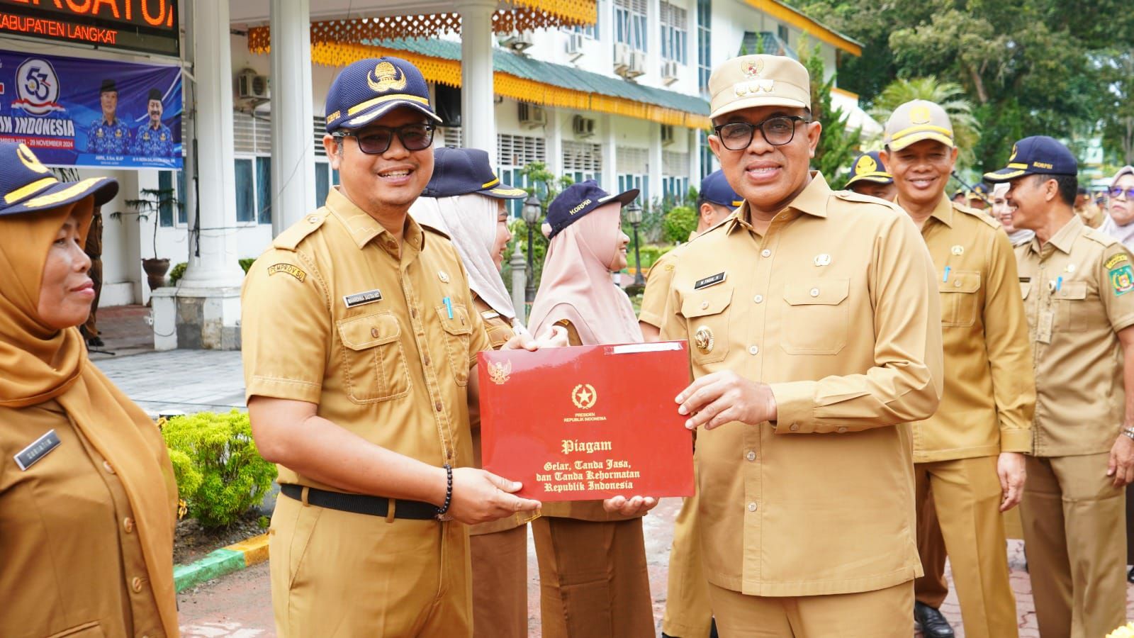 Apel gabungan ini juga menjadi momen penganugerahan tanda kehormatan Satyalancana Karya Satya kepada enam ASN Pemkab Langkat. Penghargaan ini diberikan berdasarkan Keputusan Presiden Republik Indonesia Nomor 67/TK/Tahun 2024, sebagai apresiasi atas dedikasi ASN yang telah mengabdi selama 10, 20, hingga 30 tahun.