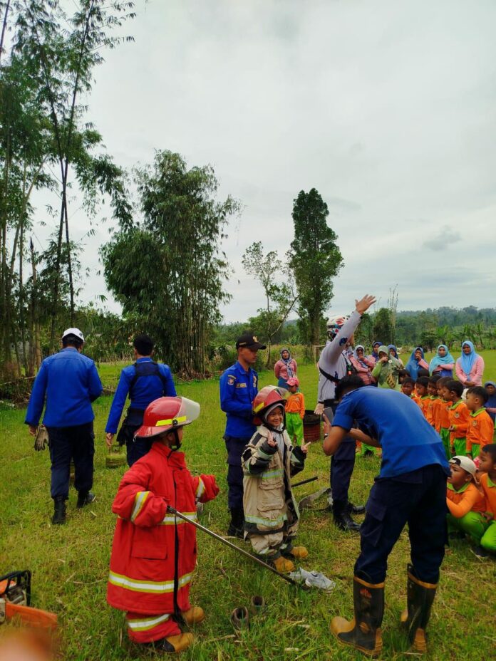 Pemadam Kebakaran (Damkar) Banjarnegara melakukan simulasi, edukasi tentang bahasa kebakaran, bersama puluhan anak-anak TK PGRI AL Amin Tempuran