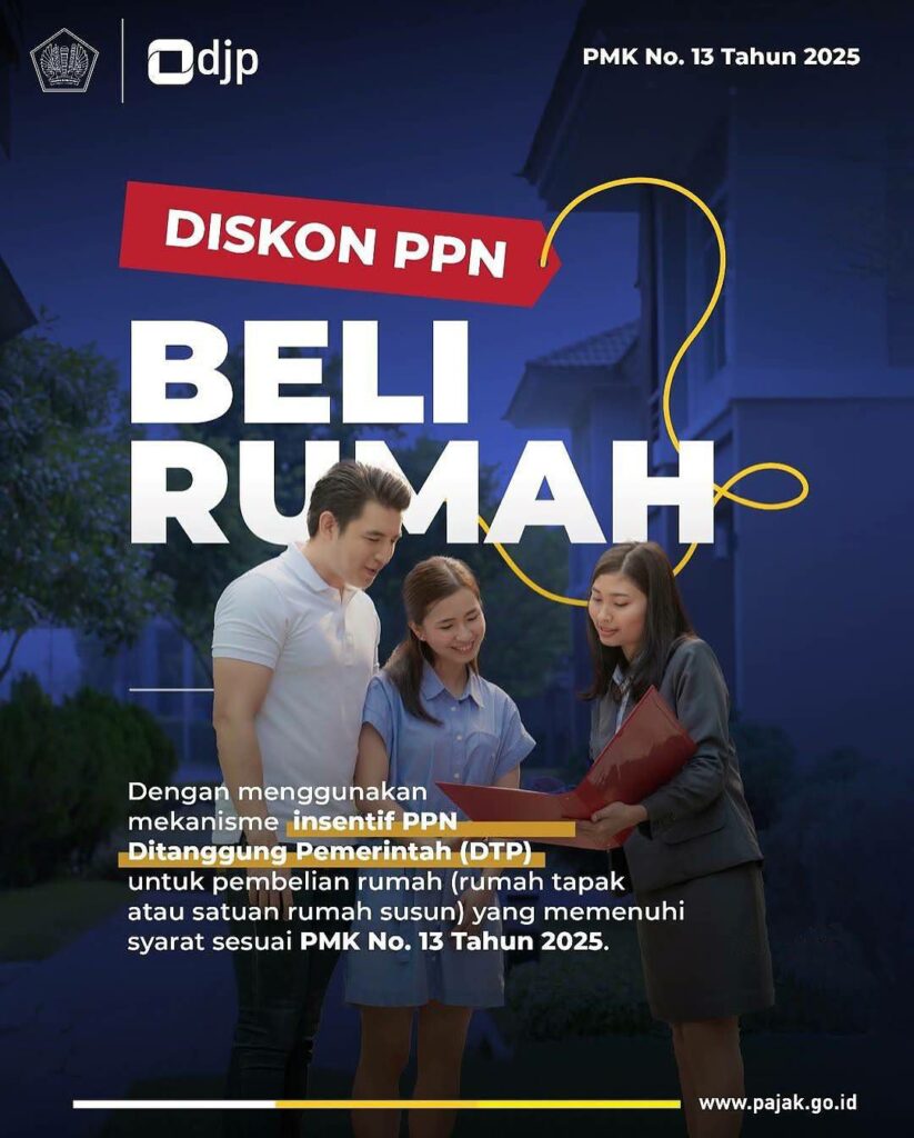 Ketentuan selengkapnya terkait hal ini dapat dilihat di salinan Peraturan Menteri Keuangan Nomor 13 Tahun 2025 tentang Pajak Pertambahan Nilai atas Penyerahan Rumah Tapak dan Satuan Rumah Susun yang Ditanggung Pemerintah Tahun Anggaran 2025 dapat diunduh di laman landas www.pajak.go.id.