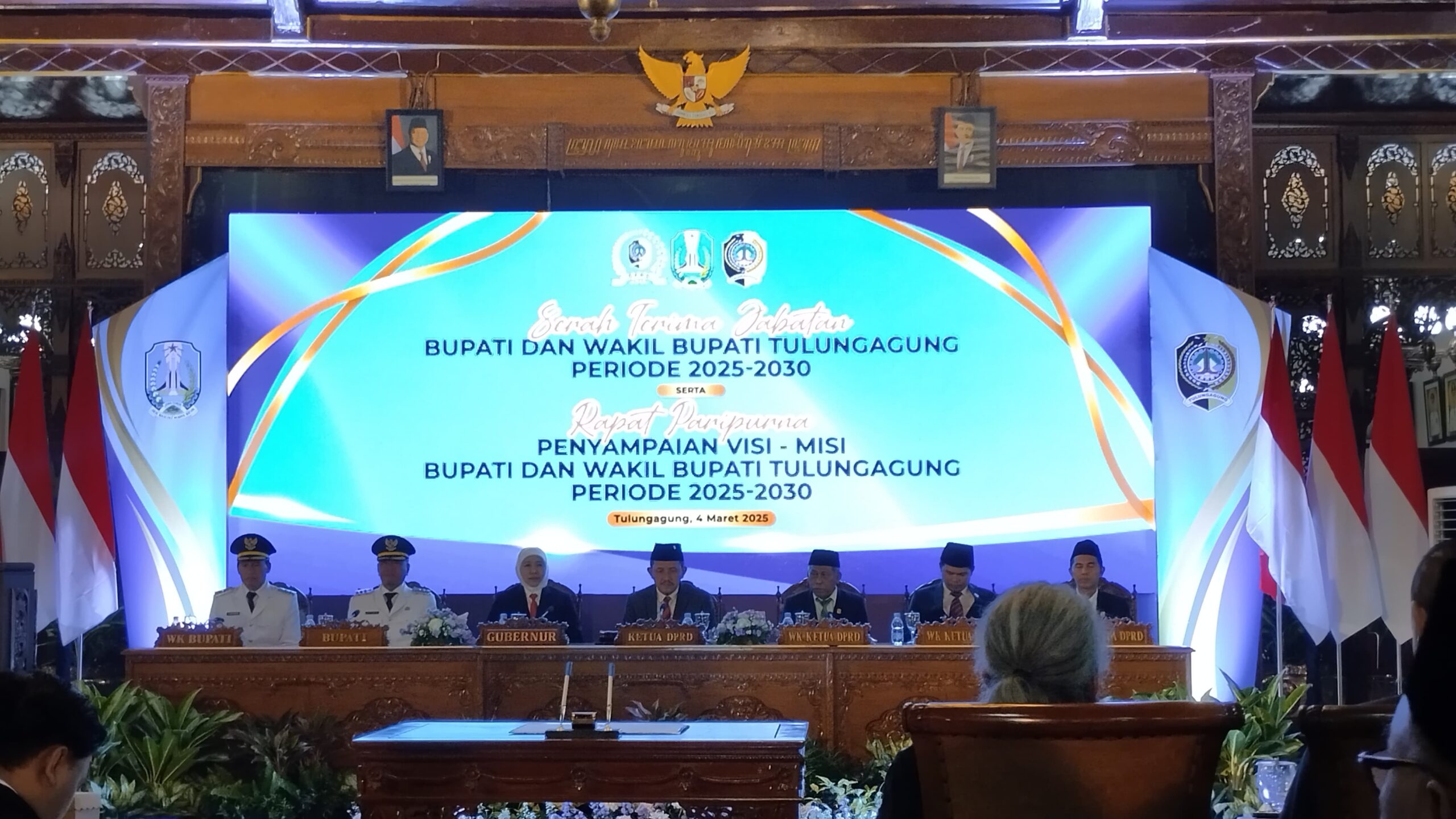 Kolaborasi antara pemerintah pusat, daerah, dan DPRD Tulungagung berhasil menggelar acara serah terima jabatan Bupati Tulungagung dan rapat paripurna DPRD Kabupaten Tulungagung, yang diadakan pada Selasa, 4 Maret 2025, di Pendopo Agung Tulungagung Kongas Arum Kusumaning Bongso. Agenda utama acara tersebut adalah penyampaian visi-misi Bupati dan Wakil Bupati Tulungagung untuk periode 2025-2030.