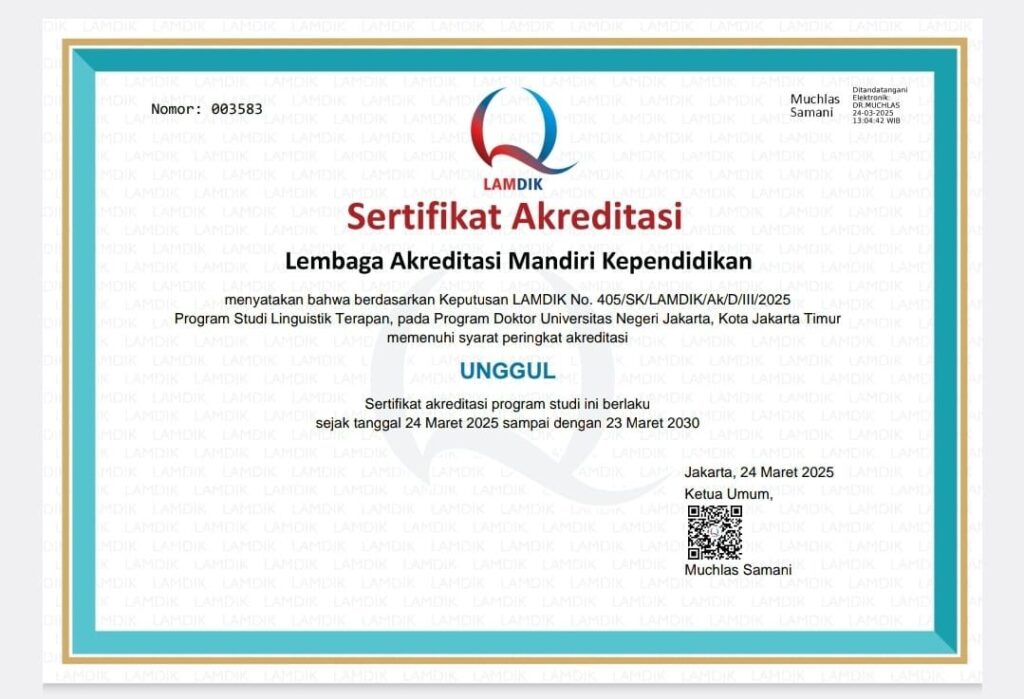 Dengan raihan akreditasi Unggul dari LAMDIK, Program Studi Doktor Linguistik Terapan UNJ menegaskan komitmennya dalam mencetak lulusan yang mampu berkontribusi aktif dalam pengembangan ilmu linguistik terapan dan pendidikan bahasa, baik di tingkat nasional maupun global.