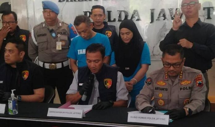 GlobalCyber News.Com. -Jateng Semarang — Ketua Pemuda Pancasila (PP) Kabupaten Blora, Munaji dan Istrinya, WH hanya bisa tertunduk lesu di kantor Ditreskrimum Polda Jateng Kamis, (22/5/25) pihak kepolisian menggelar konferensi pers Bersama puluhan awak media konferensi pers ini digelar karena keduanya terlibat kasus penipuan