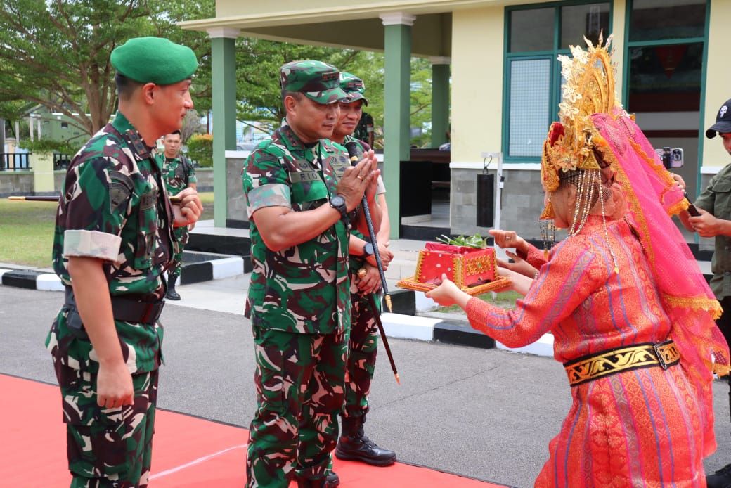 Global Cyber News.Com. -NATUNA – Pangdam I/Bukit Barisan Mayjen TNI Rio Firdianto, didampingi Ketua Persit Kartika Chandra Kirana Daerah I/BB Ny. Galuh Firdianto dan rombongan, melaksanakan kunjungan kerja ke Batalyon Komposit 1/Gardapati di Natuna, Rabu (11/6/2025). Kedatangan Pangdam disambut dengan prosesi adat Melayu berupa pemasangan tanjak oleh Bupati Natuna serta ritual tepung tawar sebagai bentuk penghormatan dan penerimaan adat di wilayah perbatasan tersebut.