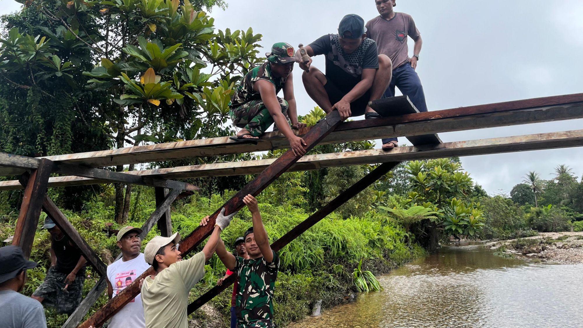 Global Cyber News.Com. -Fak Fak – Pos Tomage Satgas Yonif 642/Kps melaksanakan Karya bakti memperbaiki Jembatan Kampung Wasa Mulya penghubung menuju Kampung Warissa Mulya Distrik Tomage Kabupaten Fak-Fak, Papua Barat, Rabu (25/06/2025).