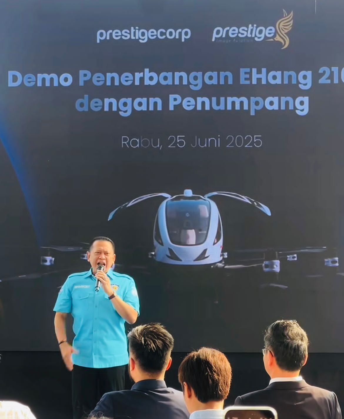 Hadir antara lain Utusan Khusus Presiden Bidang Pembinaan Generasi Muda dan Pekerja Seni Raffi Ahmad yang juga Ketua Bidang Media dan Komunikasi IMI, Executive Chairman Prestige Aviation Rudy Salim, Chief Financial Officer EHang China Conor, serta Komunikasi dan Media IMI Dwi Nugroho Marsudianto.
