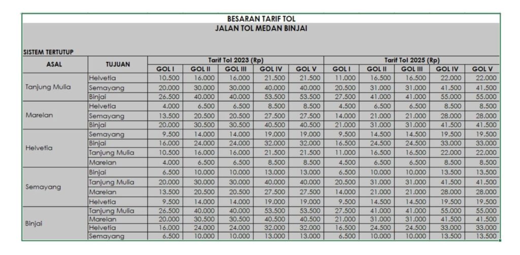 penyesuaian tarif pada Jalan Tol Medan-Binjai menyusul diterbitkannya Surat
