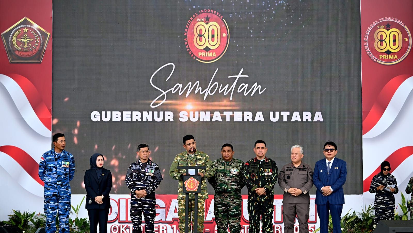 “Hari ini, saya bersama seluruh Forkopimda Sumatera Utara mengikuti peringatan hari penting dan bersejarah bagi TNI dan bangsa Indonesia, upacara Hari Ulang Tahun ke-80 TNI. Momen ini menjadi sangat penting bagi kita, karena menjadi pengingat untuk terus memperkokoh komitmen pengabdian. Serta, menjadi momen untuk memperkuat langkah-langkah kolaborasi yang telah terjalin,” ujarnya.
