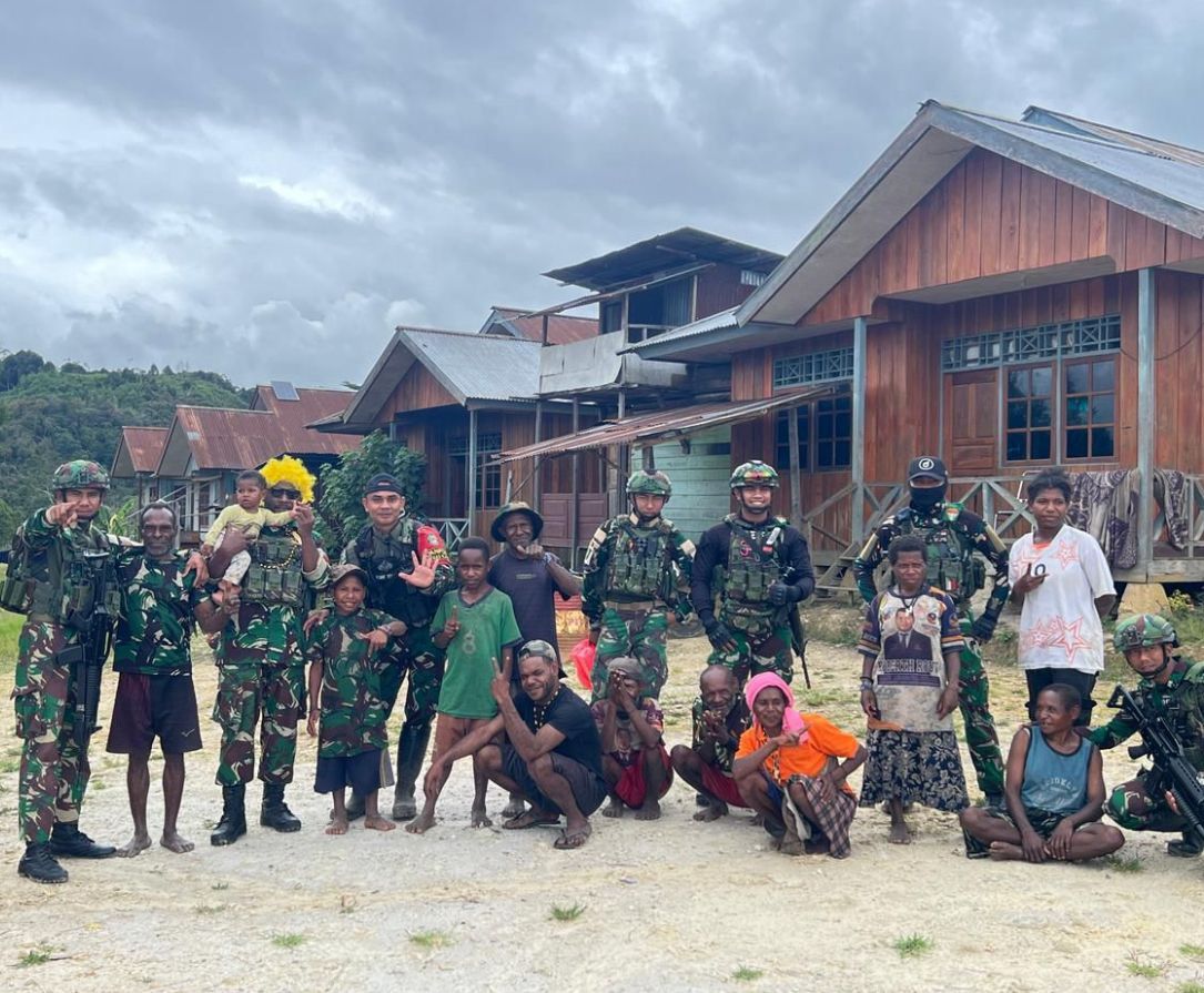 Global Cyber News.Com. -Etilkatop, Pegunungan Bintang — Pos Parim Satgas Yonif 751/Vira Jaya Sakti (VJS) melaksanakan kegiatan anjangsana ke Kampung Etilkatop sebagai upaya mempererat kedekatan dengan masyarakat, khususnya anak-anak di wilayah perbatasan. Kegiatan ini dikemas hangat dan kreatif dengan kehadiran sosok “Bapak Yakob”, maskot Satgas Yonif 751/VJS yang tampil menggunakan wig rambut kuning sebagai ikon ceria untuk menarik perhatian dan menumbuhkan rasa nyaman serta kedekatan emosional bagi anak-anak terhadap prajurit TNI. (Senin,10/11/2025).
